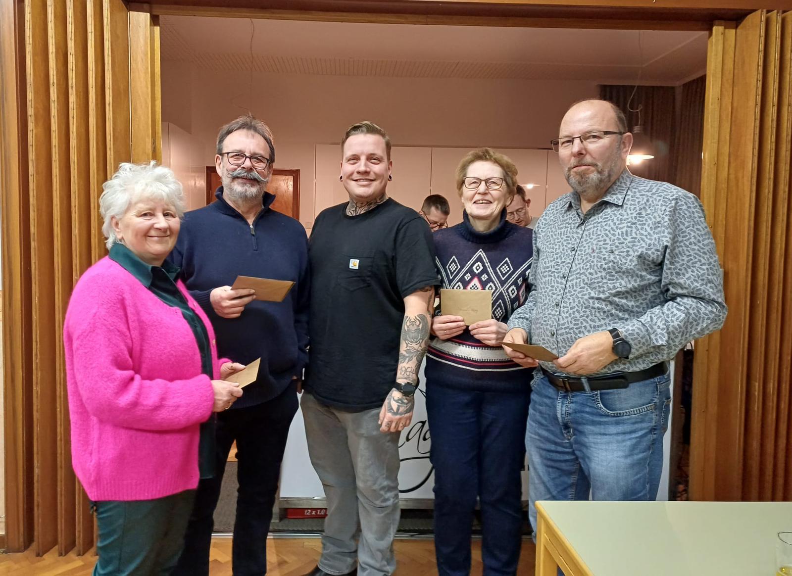 JHV_Ziegler_2026_Ehrungen Bildrechte Ziegler- und Arbeiterverein Westorf Vereinsvorsitzender Michael Strate (Mitte) ehrt die Mitglieder (von links) Sandra Tabellion, Jörg Tabellion, Manuela Kley und Axel Bünger. |
